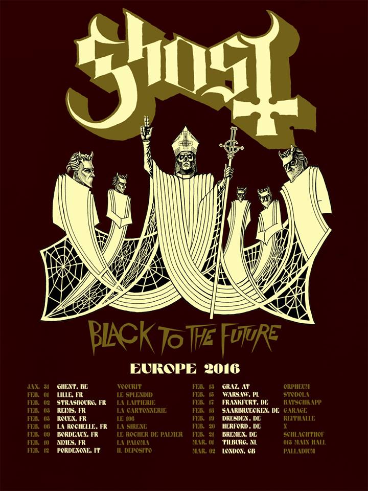 Ghost est un groupe suédois de métal aux sonorités hard rock, formé en 2008. Le principe du groupe repose sur un Pape sataniste, appelé Papa Emeritus, épaulé par ses disciples, les Goules Sans Nom. Le groupe, qui ne révèle ni visages ni noms, a la réputation d’être spectaculaire lors de ses concerts, que ce soit par les tenues ou par la mise en scène et les décors.
