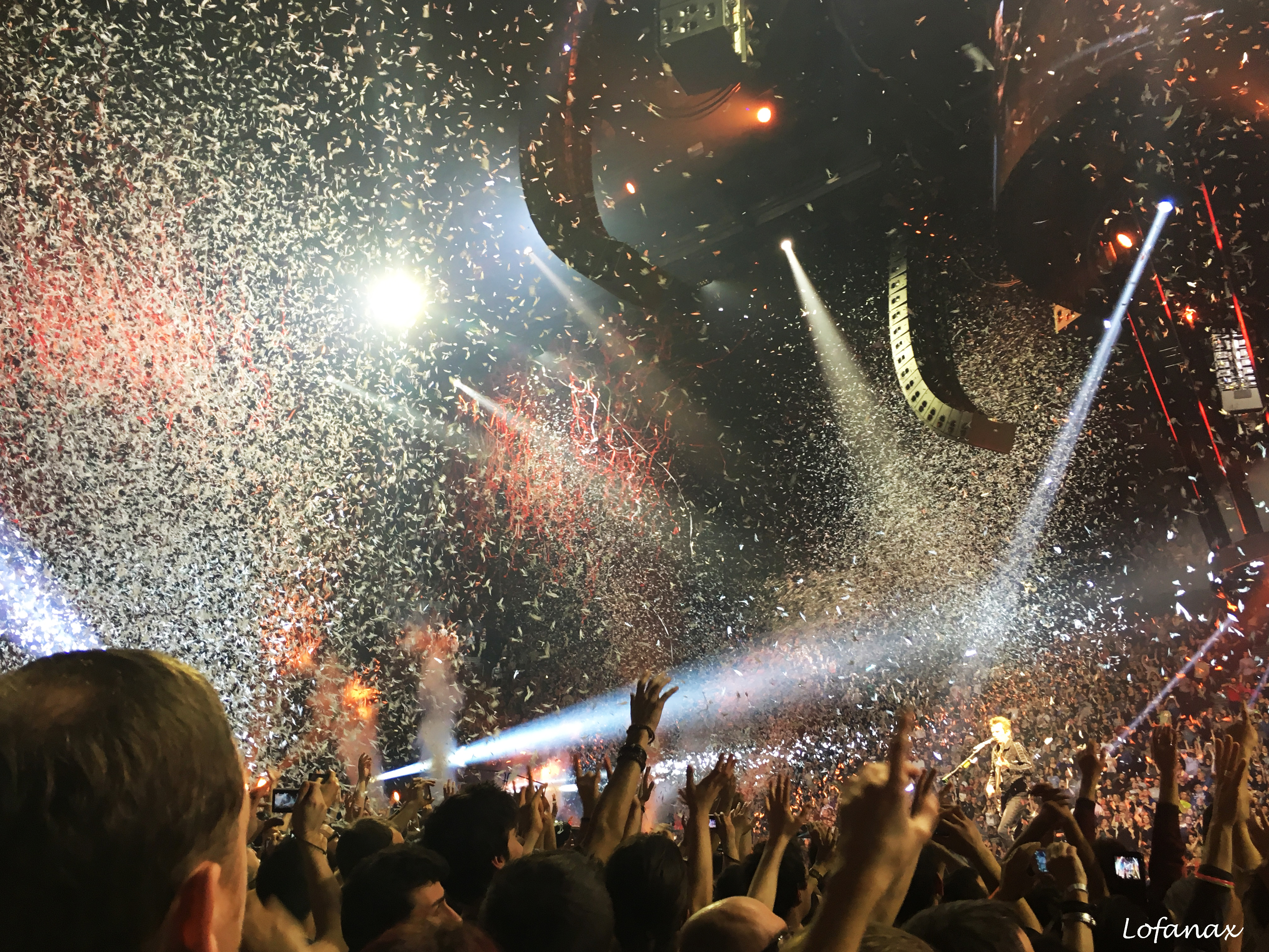 Pas de rappel à proprement dit, mais une nouvelle fois la musique de Drones. Et puis le groupe revient avec le titre Mercy, avec un impressionnant feu d’artifice de confettis (en forme de bonhommes) et un final sur Knights of Cydonia avec cet intro habituel à l’harmonica, à base de Man with a Harmonica d’Ennio Morricone .