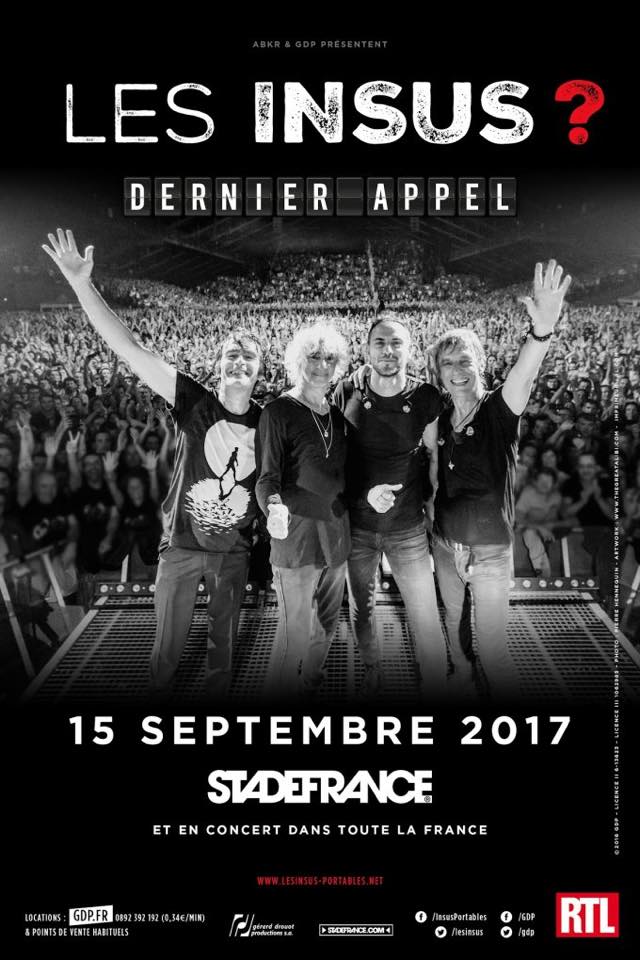On s’en doutait, le concert de ce soir au Zénith de Paris ne sera pas le dernier des Insus. Annoncé ce soir au JT de TF1, la tournée va continuer « dans toute la France » (dizaine de festivals) et ils se produiront au Stade pour un “Dernier Appel” le vendredi 15 septembre 2017. Ils ne pouvaient pas s’arrêter en si bon chemin : en sept mois et 55 concerts à guichets fermés, Les Insus auront déjà joué devant 650 000 personnes…