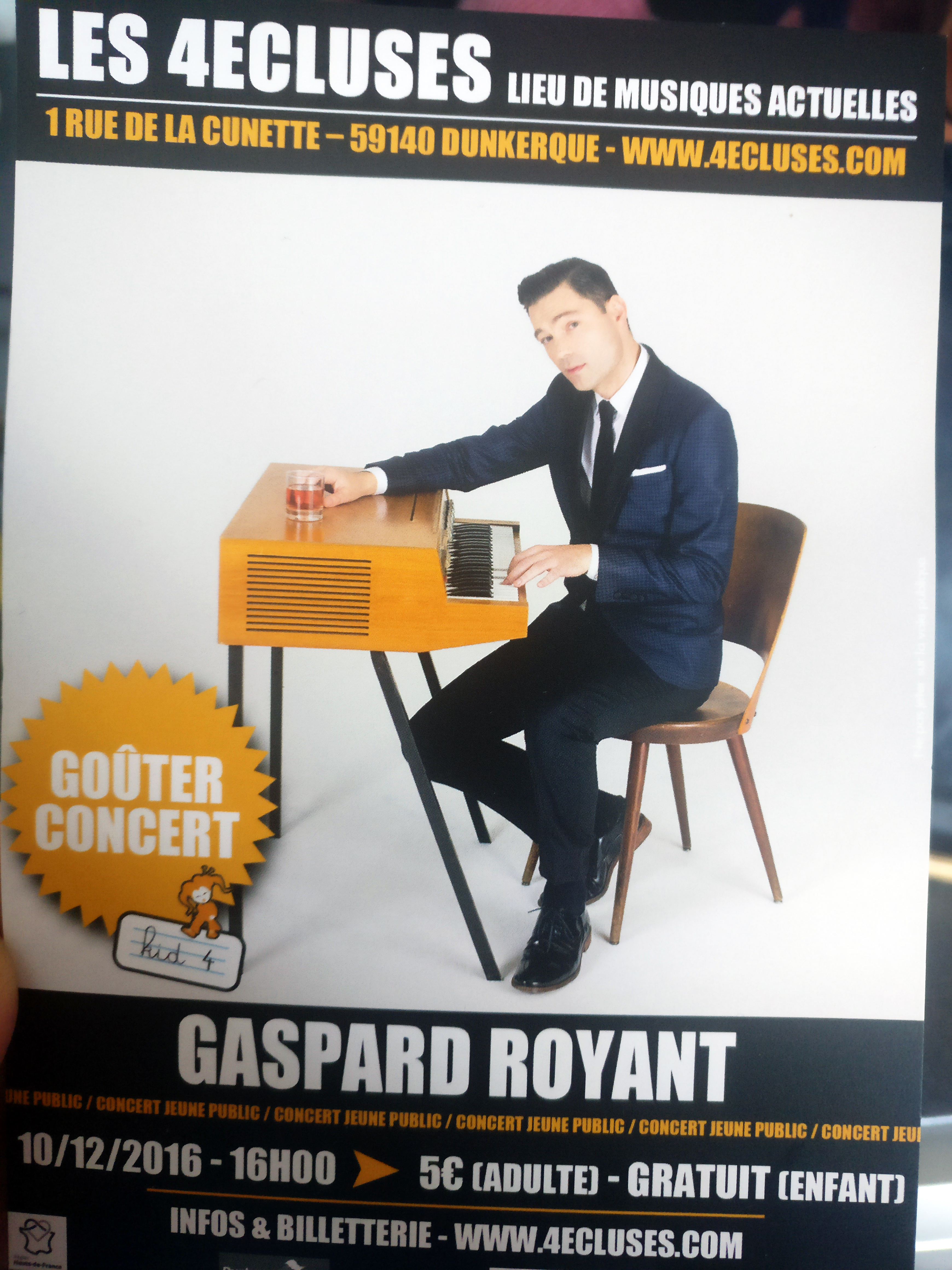 Le dernier concert de l’année 2016 pour nous aura été le charmant gig qu’a proposé Gaspard Royant aux 4 Ecluses de Dunkerque le 10 décembre dernier. Nous n’étions malheureusement pas disponible pour le concert du soir, aussi, et c’est une première pour nous, nous avons assisté au « gouter concert » que la salle a organisé l’après midi pour le jeune public.