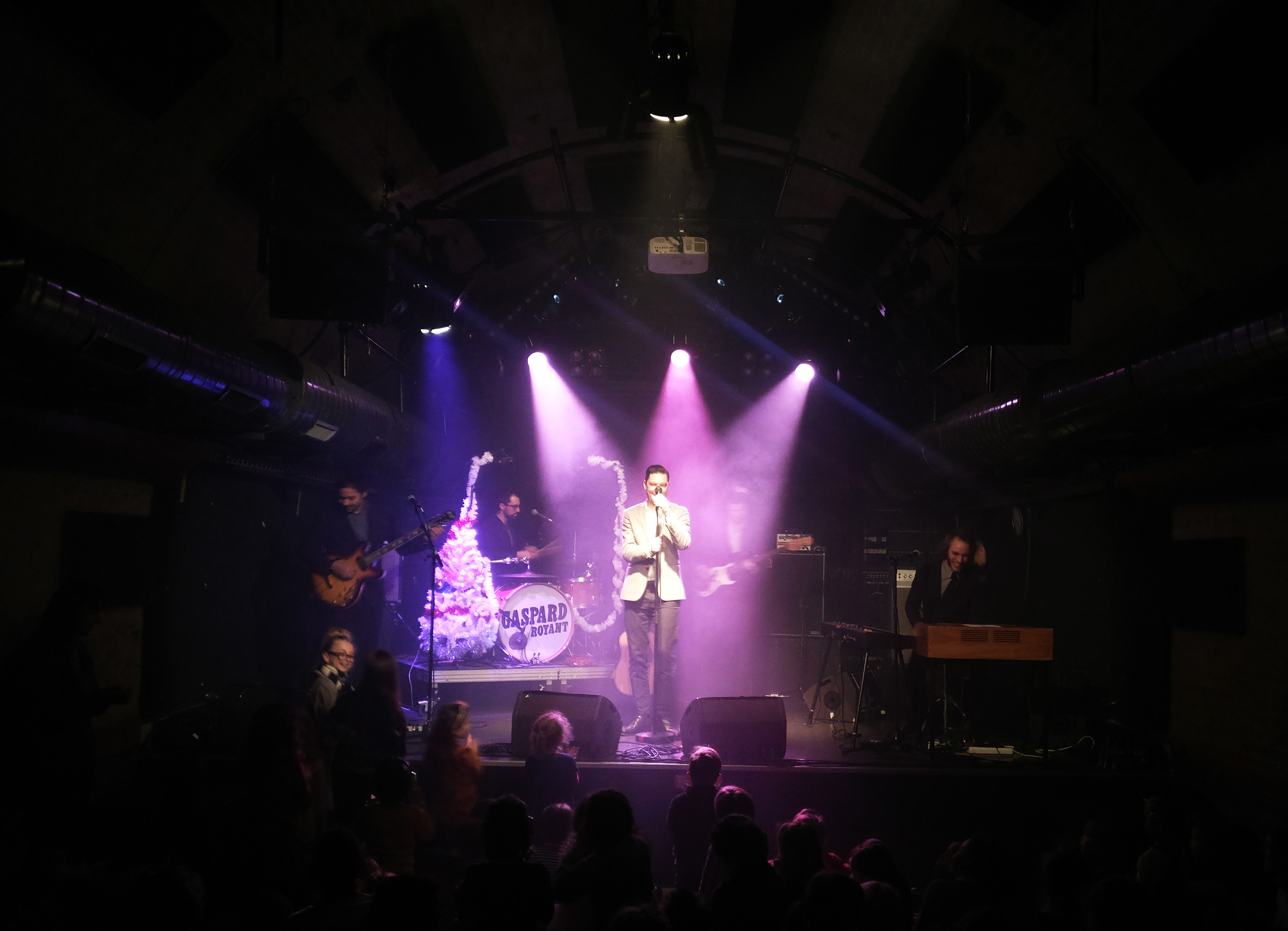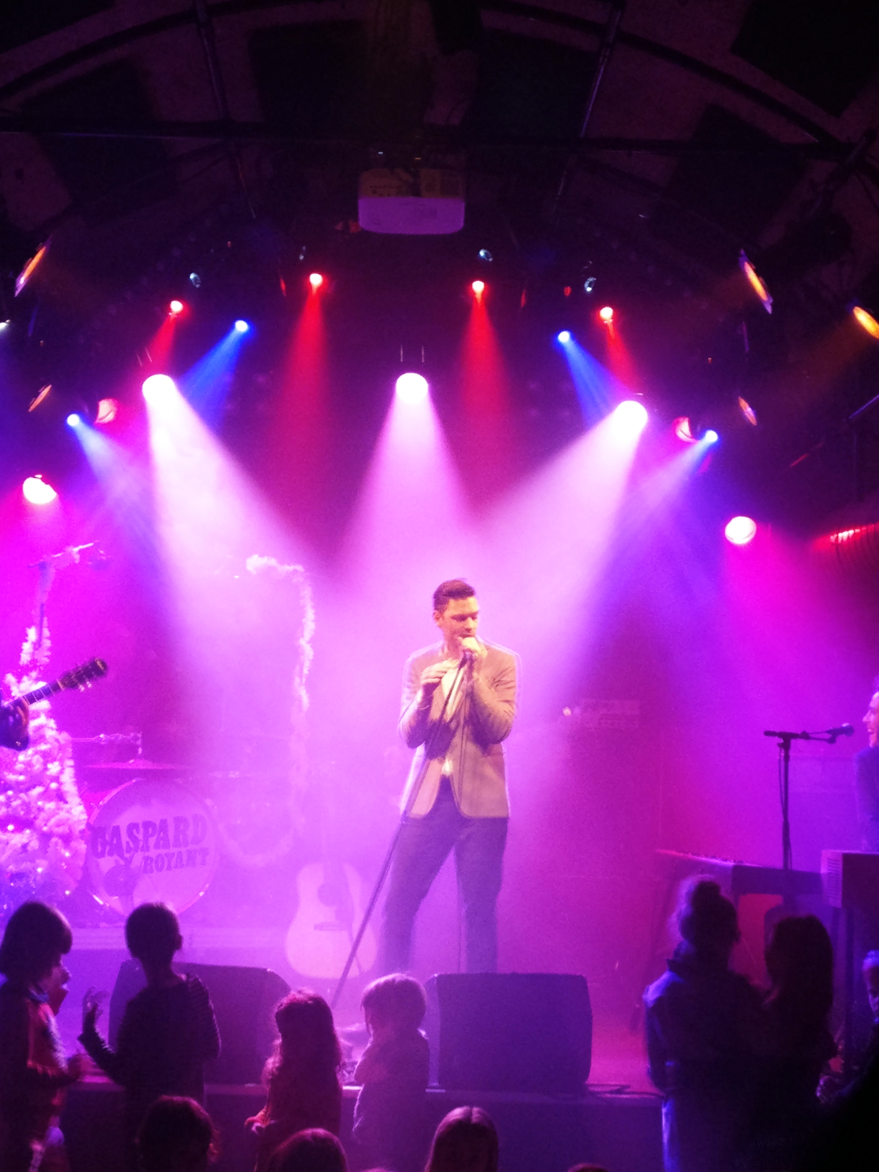 Gaspard arrive à l’heure dite, accompagné de son groupe. Un sapin de Noël se trouve sur scène. Et pendant une heure, le crooner, tout en élégance vintage envoi son garage’n’roll sous les yeux ébahis des Kid’s qui ne se font pas prier et instinctivement se déhanchent au son du doo wop. C’est extrêmement touchant de voir les mômes danser, sans filtres, sans posture… Et les parents ne se font pas prier. Le groupe envoie, ça groove, la rythmique assure aussi les chœurs, Gaspard a l’air d’être le plus gentil rocker du monde.