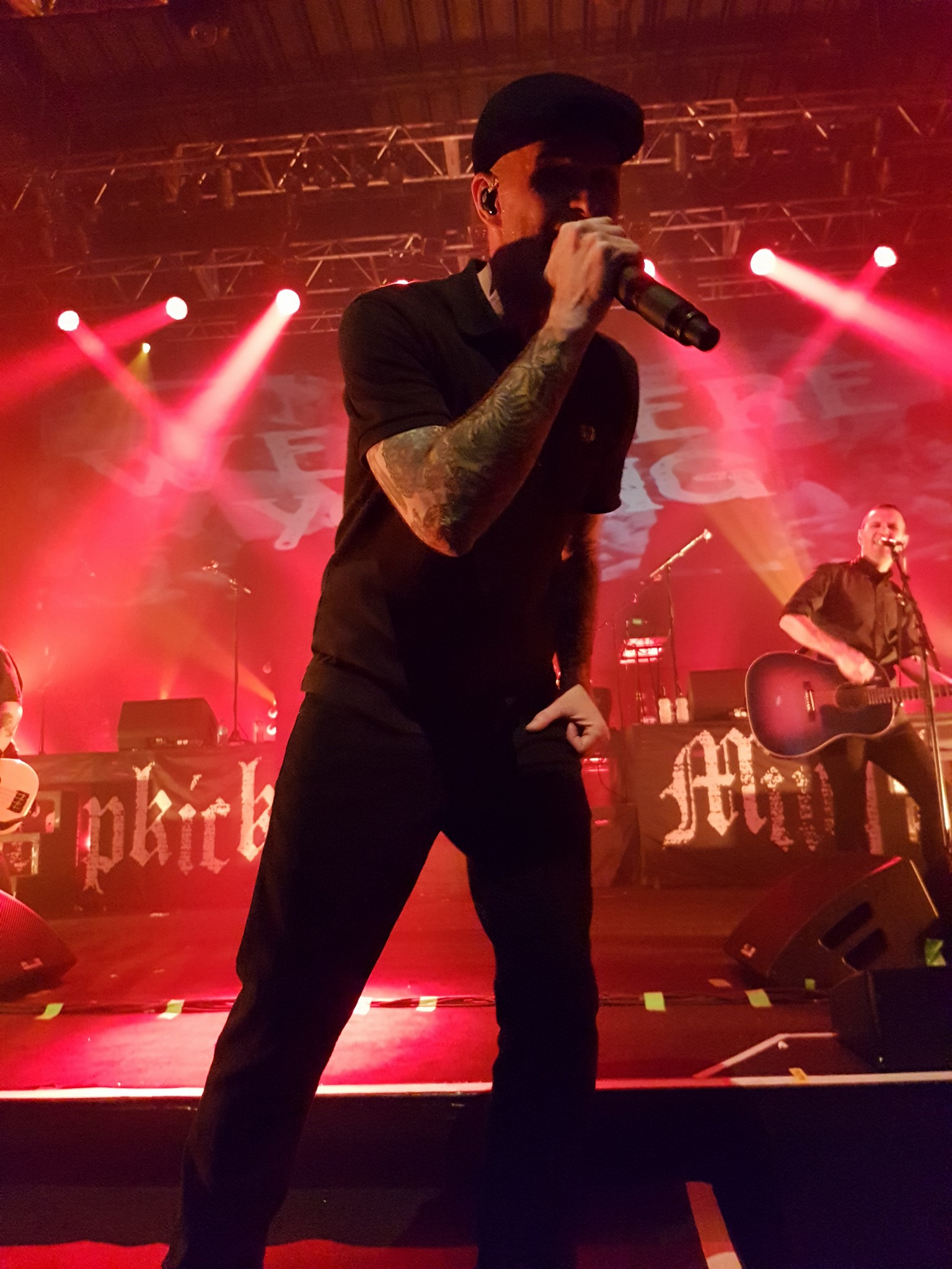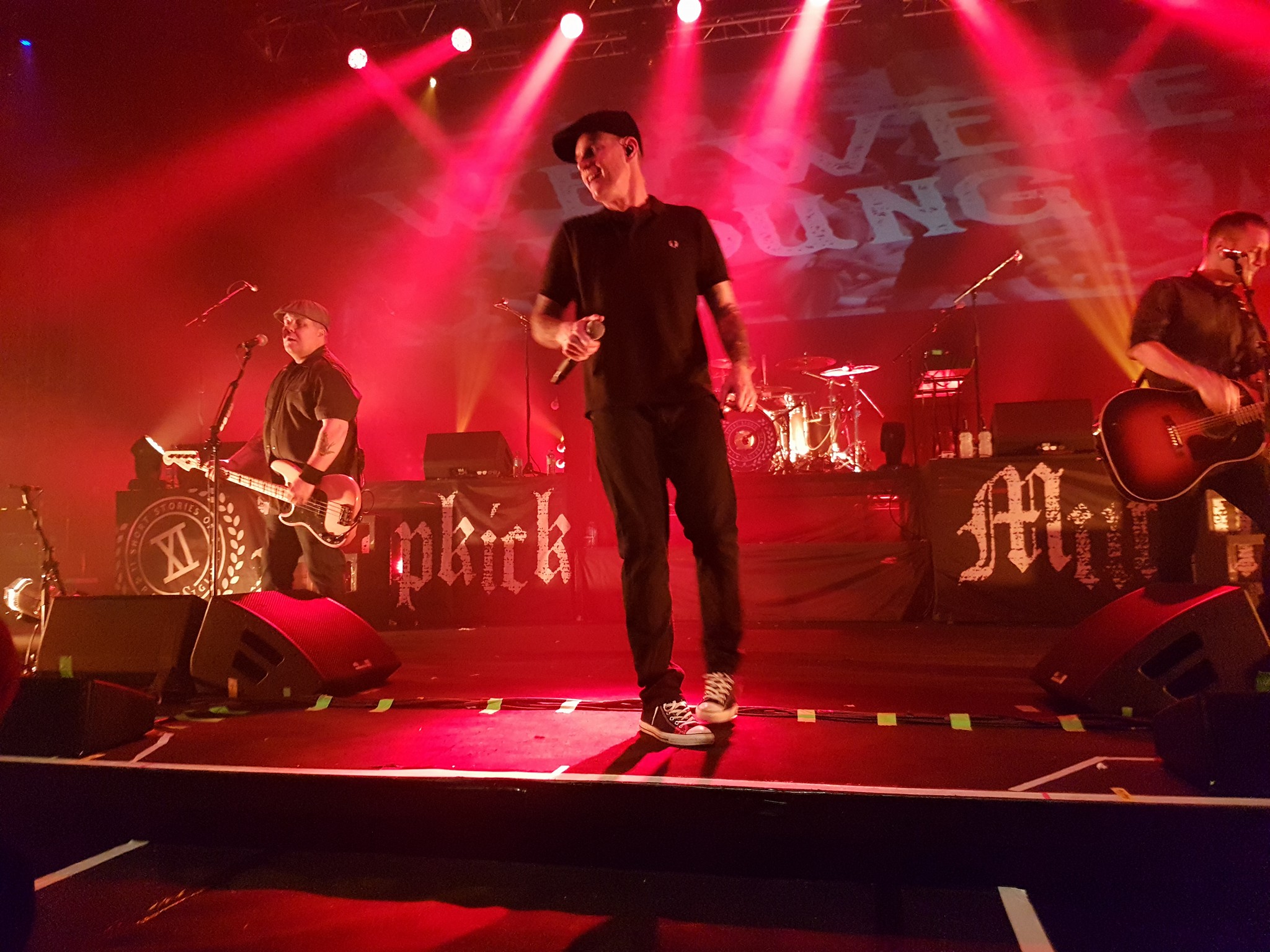 Une musique celtique, suivi du premier titre de leur dernier album »The Lonesome Boatman » se fait entendre et leurs silhouettes se dessinent sur le rideau. Celui ci tombe et le groupe s’offre à nous. Une scène à étage est donc érigée avec un écran géant derrière eux qui servira à faire défiler pochettes d’albums, artwork du groupe et les textes des chansons invitant l’aéronef à chanter avec eux. Ça bouge ! Beaucoup ! Aussi bien sur scène que dans la salle. Les Dropkick Murphys sont en terrain conquis. Le Frontman, Al Barr, polo Fred Perry et béret vissé sur la tête, ne tient pas en place et viendra régulièrement sur les barrières taper dans nos mains et nous tendre le micro. Les sourires se dessinent, ils sont touchés par l’atmosphère qui règne dans la salle.